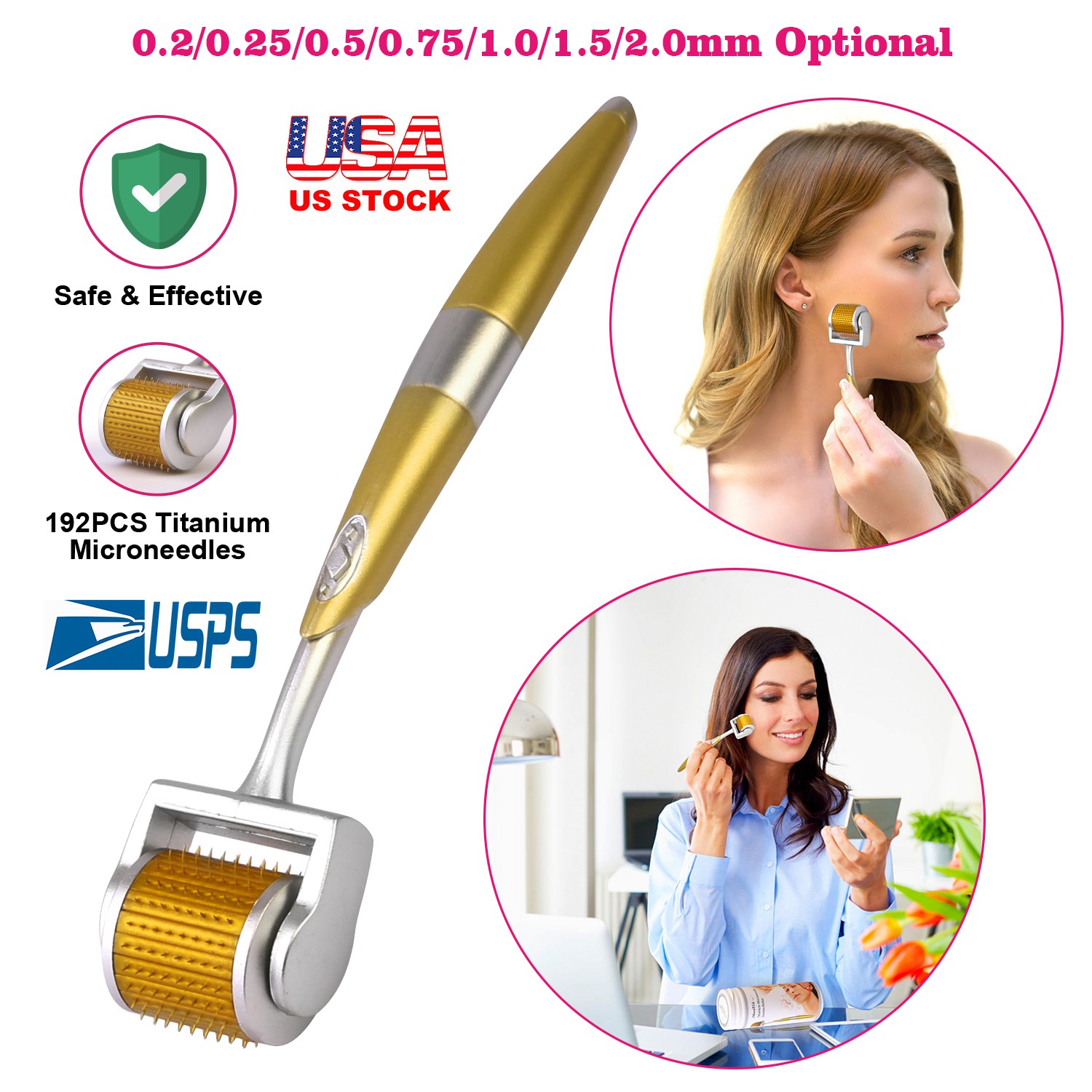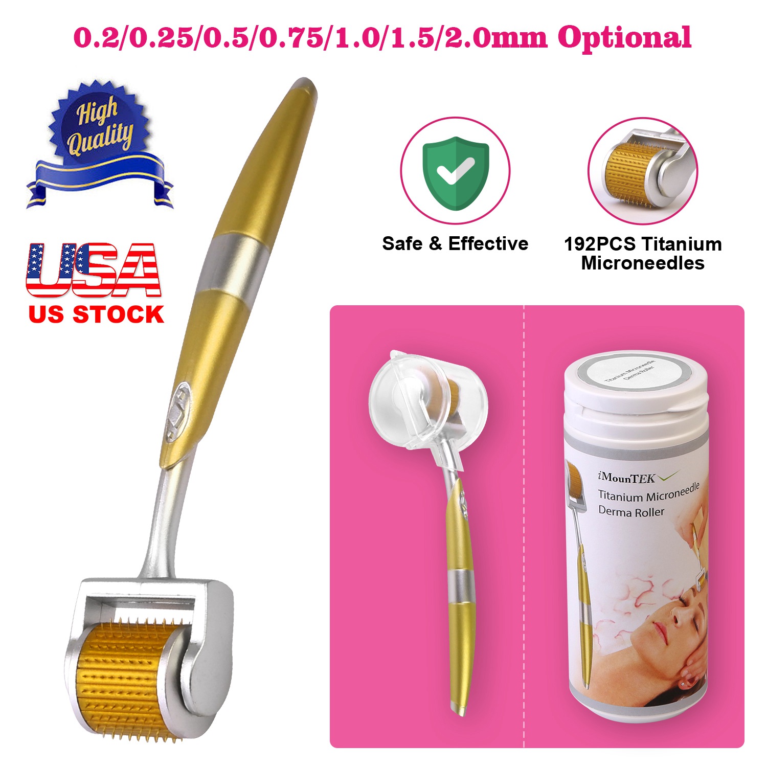 Our microneedle derma roller adopts 192pcs sterilized titanium microneedles to provide an effective safe way of non-surgical skin treatment by instantly creating numerous tiny punctures to boost skin care product absorption by allowing serum, cream or other topical agents to penetrate deep underneath the dermis layer (trans-dermal absorption). It includes 7 sizes (0.2/0.25/0.5/0.75/1.0/1.5/2.0mm), 0.2mm and 0.25mm roller is mainly used to improve eye wrinkles, dark circles, eye bag and reduce eye pigmentation. 0.5mm and 0.75mm roller is mainly used to improve facial skin conditions such as large pore, sagging skin, pigmentation etc. And 1.0mm, 1.5mm and 2.0mm roller is mainly used to improve body skin conditions such as stretch marks, scars, cellulite, etc. Additionally, it comes with a protection cover to protect the roller head and an extra cylinder container to store the roller after use.