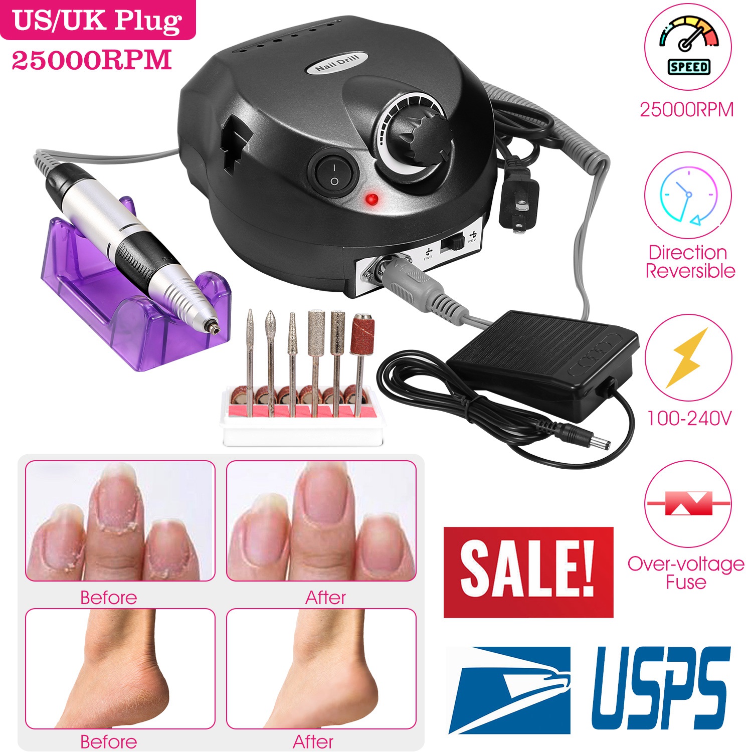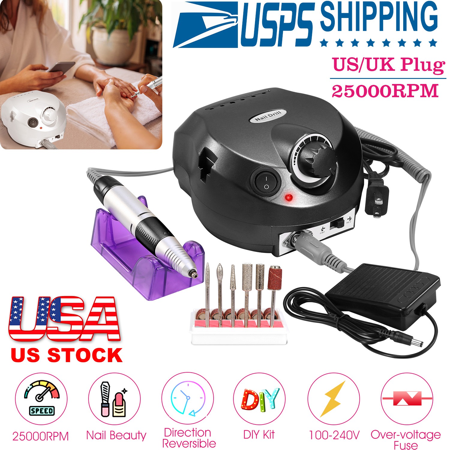 Our electric nail drill kit features with a red indicator lamp and a speed (Adjust from Min to Max Speed when in use) control slide switch, its inbuilt strong motor offers up to 25000RPM controllable speed to satisfy your needs at low noise and smooth working. Equipped with a FWD& REV switch to change directions (FWD represents clockwise, REV represents counter-clockwise), HAND and FOOT mode these 2 working modes, ideal for left or right-handed use. Comes with 6 drill bits and 6 sanding bands, an optimal acrylic nail care kit for exfoliating, grinding, polishing, carving, engraving, routing, sharpening and sanding, widely used in nail salon, beauty parlor, spa or nail DIY at home. An optimal gift for your girlfriends, friends or nail technicians.