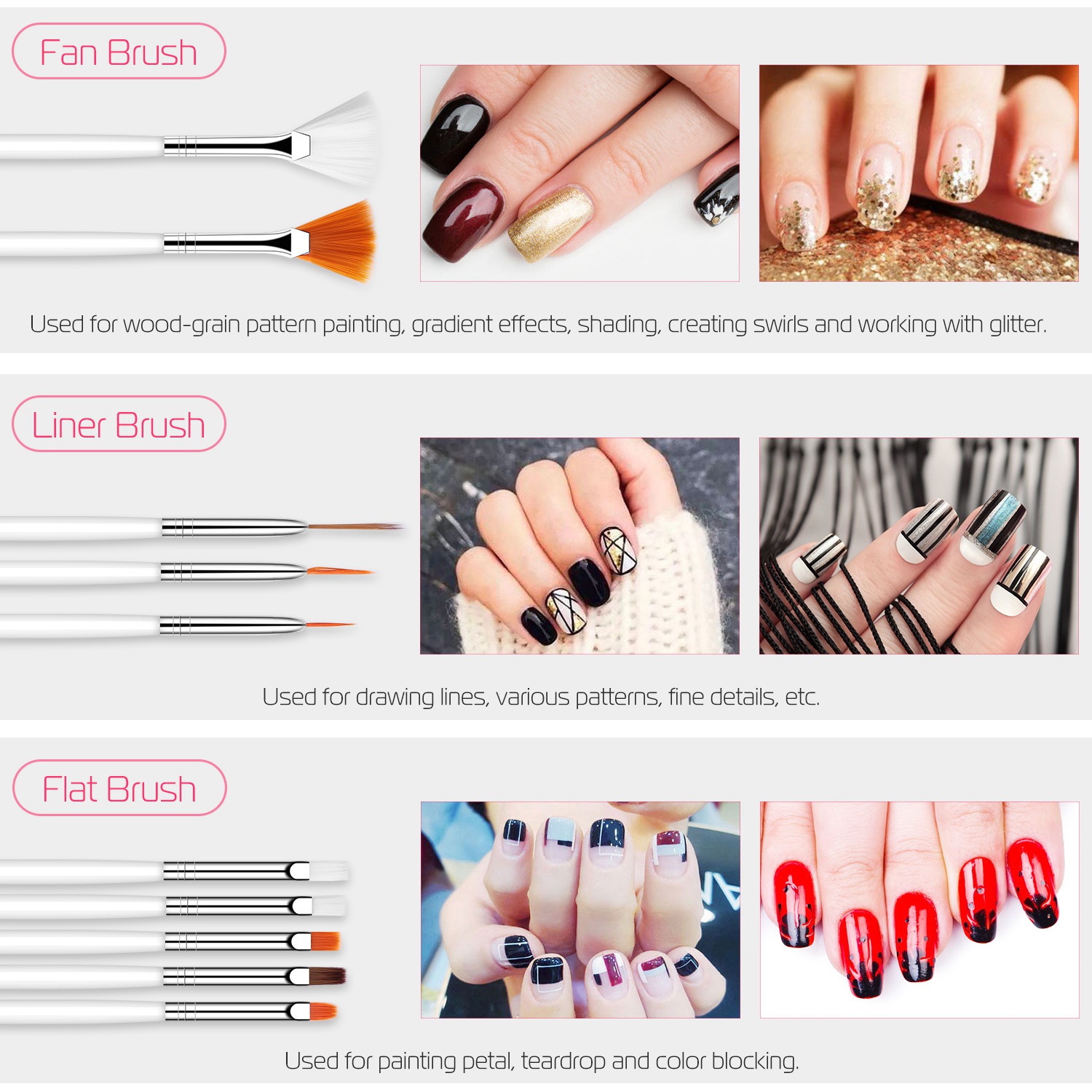 Our nail art tool is made of premium soft bristle and easy-grip pen holder for easily dipping nail polish to draw your desired nail art shapes and patterns. This tool set contains 15 brushes (different usage) and 5 dotting pens (different sizes), suitable for personal home use or professional beauty salon, which will meet all your nail art requirements. What’s important, you can feel free to use it on your fingernail for that our product doesn’t contain harmful substances and won’t cause allergy.